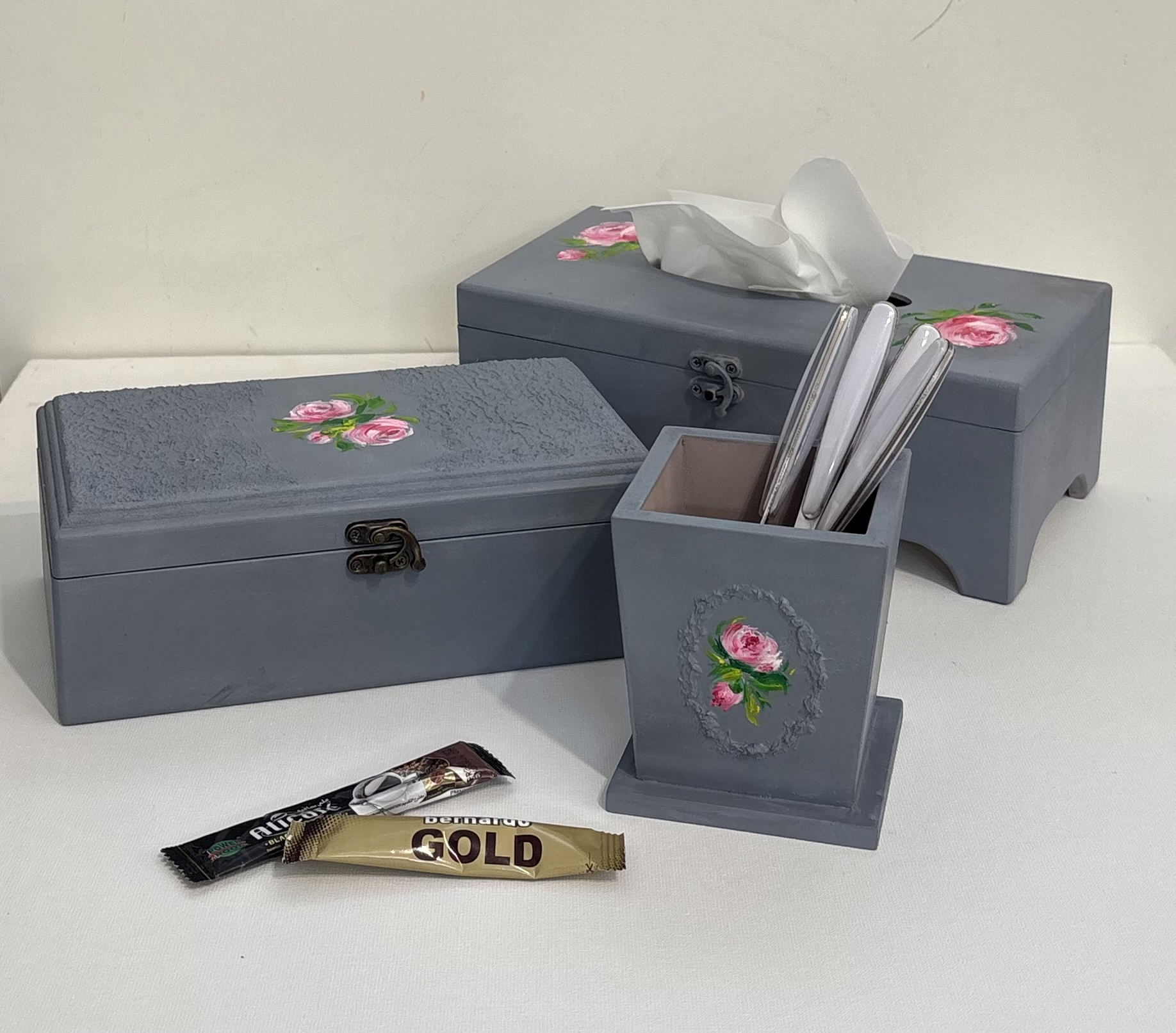 کاور دستمال کاغذی الیاف طبیعی طرح کوک دوزی طوسی زغالی و پاپیون صورتی ملایم