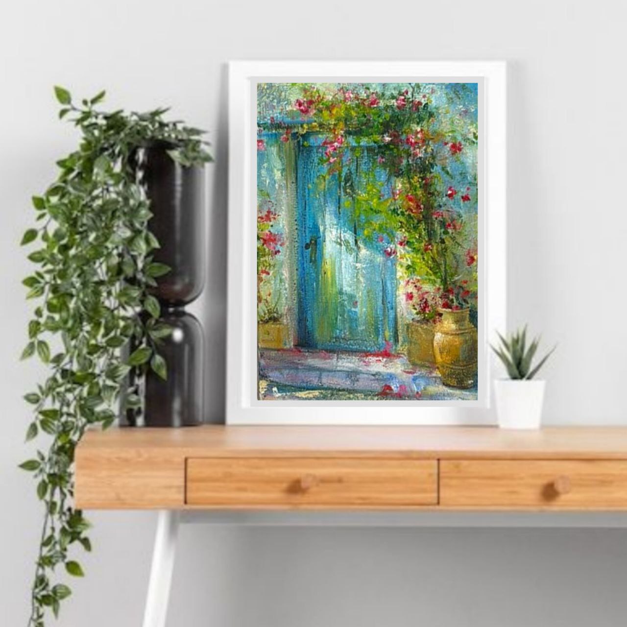 تابلو نقاشی رنگ و روغن طرح سر در قدیمی و گل کاغذی ابعاد 20*30