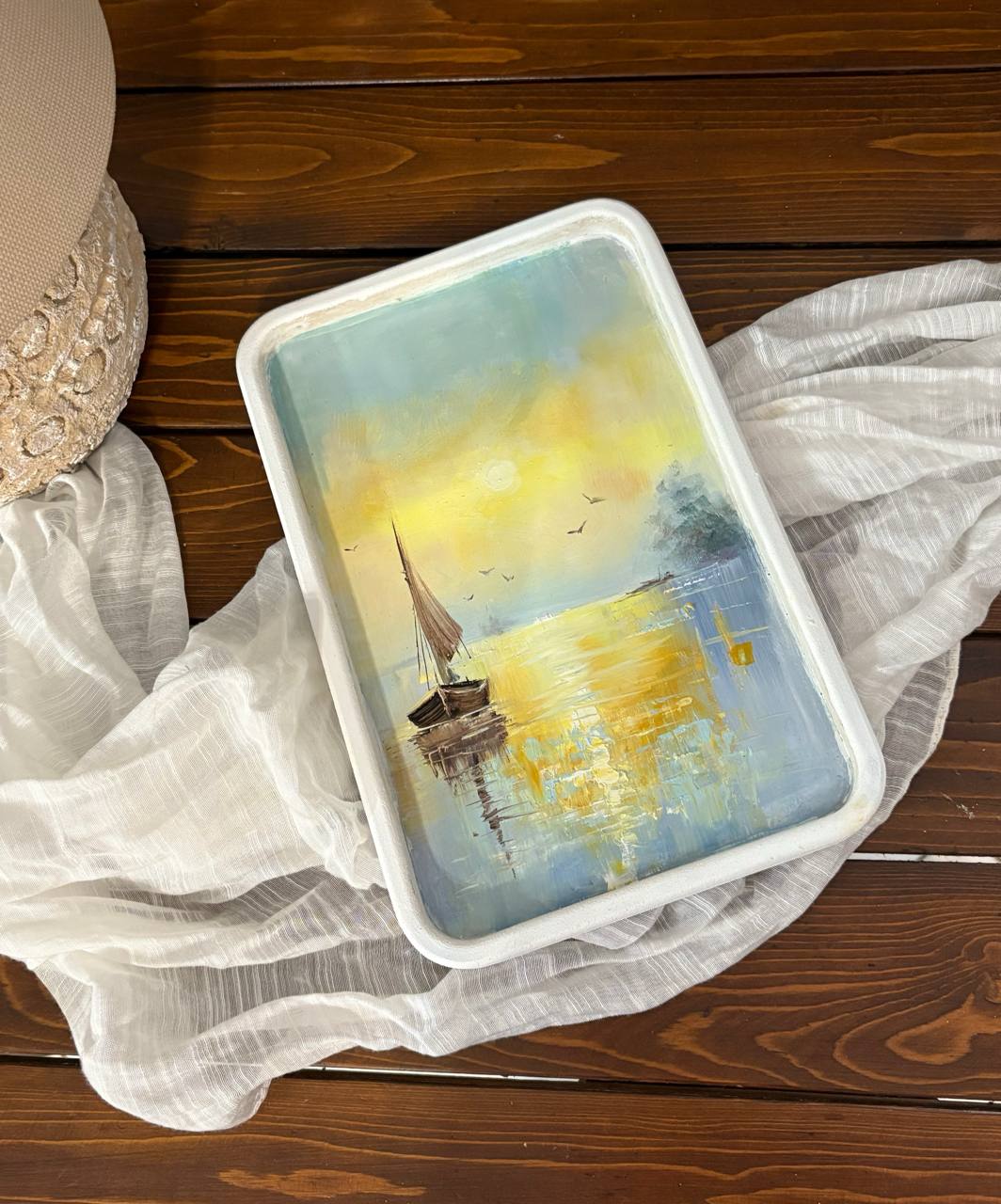 تابلو نقاشی رنگ روغن روی بوم چوبی طرح قایق آرامش