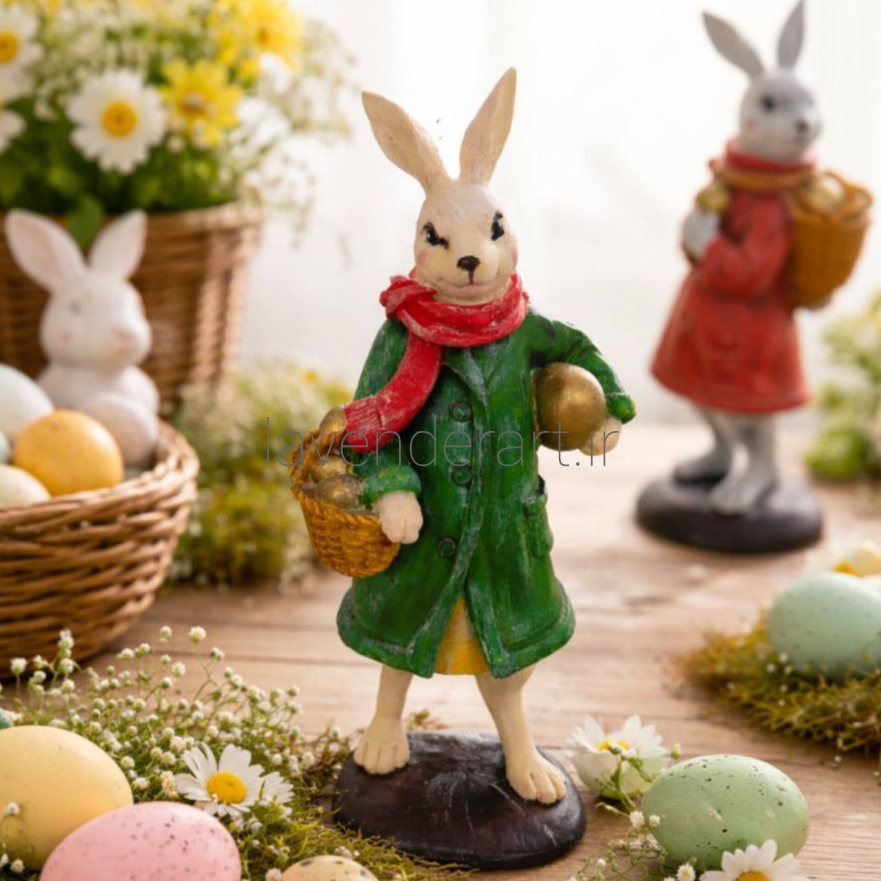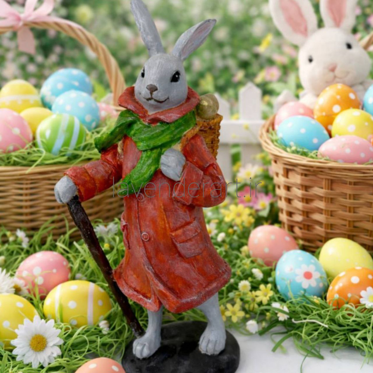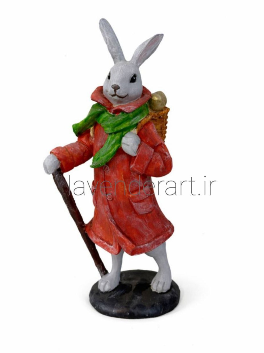 این مجسمه زیبا ، تصویری از یک خرگوش مهربان و زمستانی را به نمایش میگذارد که لباس گرم و شال بنفش به تن دارد و با عصایی در دست، به جلو میرود. سبد پشت او پر از تخممرغهای طلایی است که نمادی از شادی و نوید بهار است. این اثر هنری مناسب برای تزئین دکوراسیون داخلی خانه، مخصوصاً در فصل بهار و عید پاک، و یا به عنوان هدیهای خاص برای عزیزانتان میباشد.