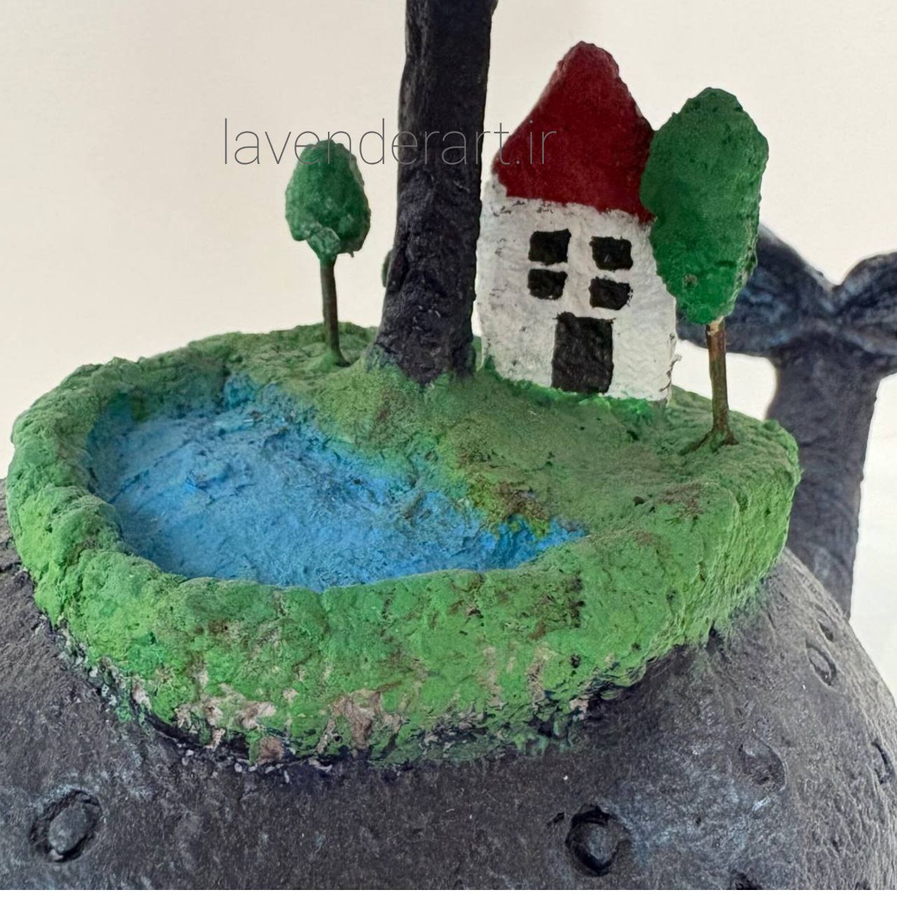 پایه نهنگ با بافتی طبیعی و لطیف، نمادی از آرامش در دل دریاست و روی سر او، کلبه ای کوچک، دو درخت و برکه ای آرام، دنیایی رویایی را تصویر می کند.