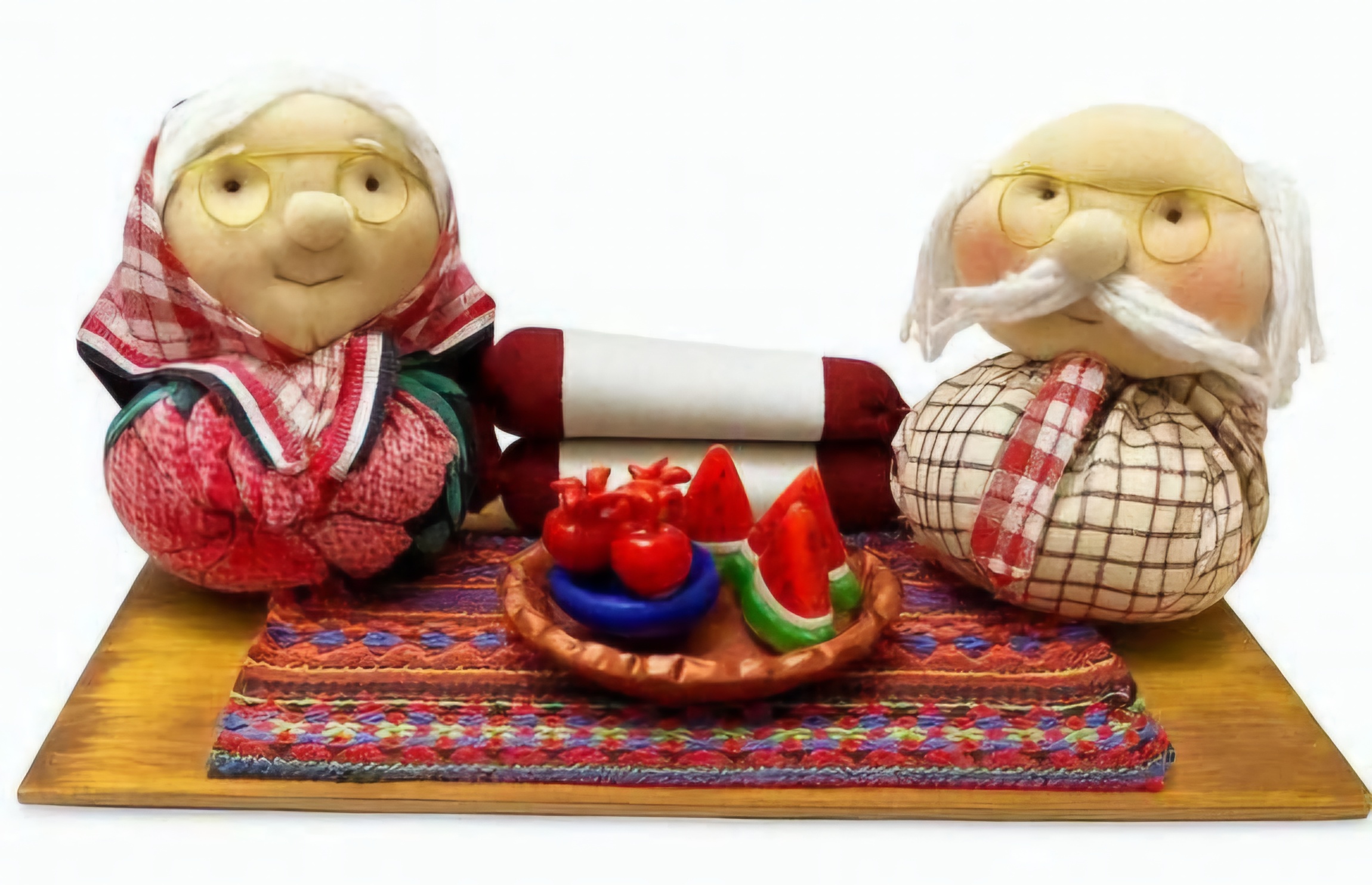 عروسک دستساز پارچه ای، سفره یلدا خمیری و پایه چوبی مدل نگهبانان گرمای یلدا