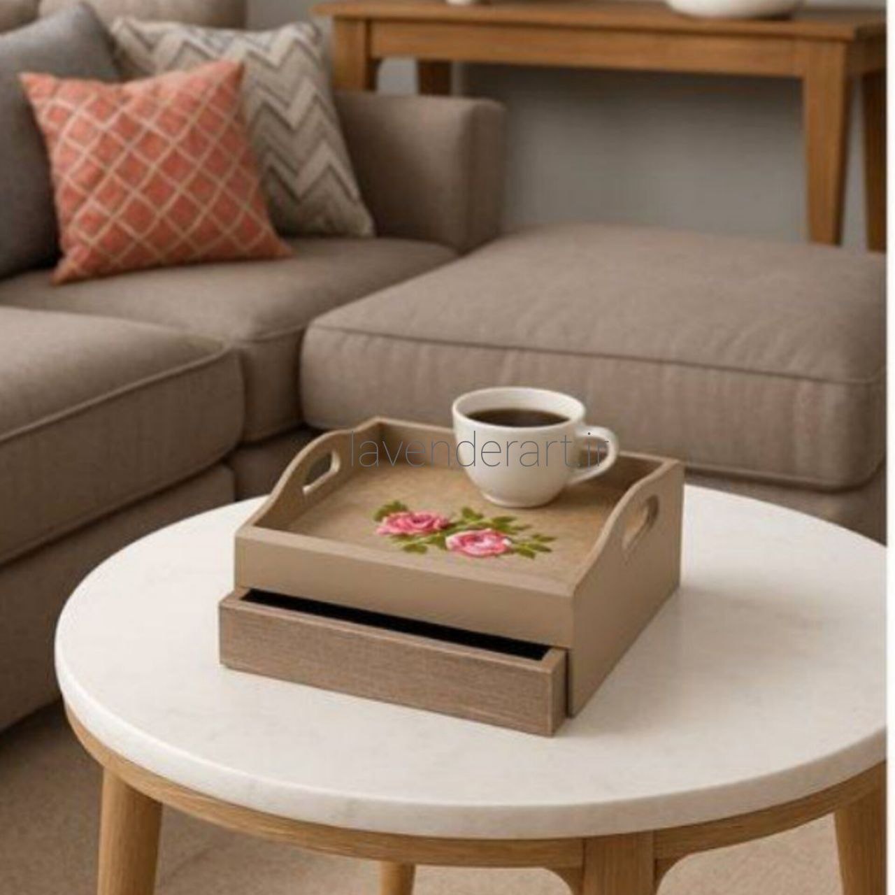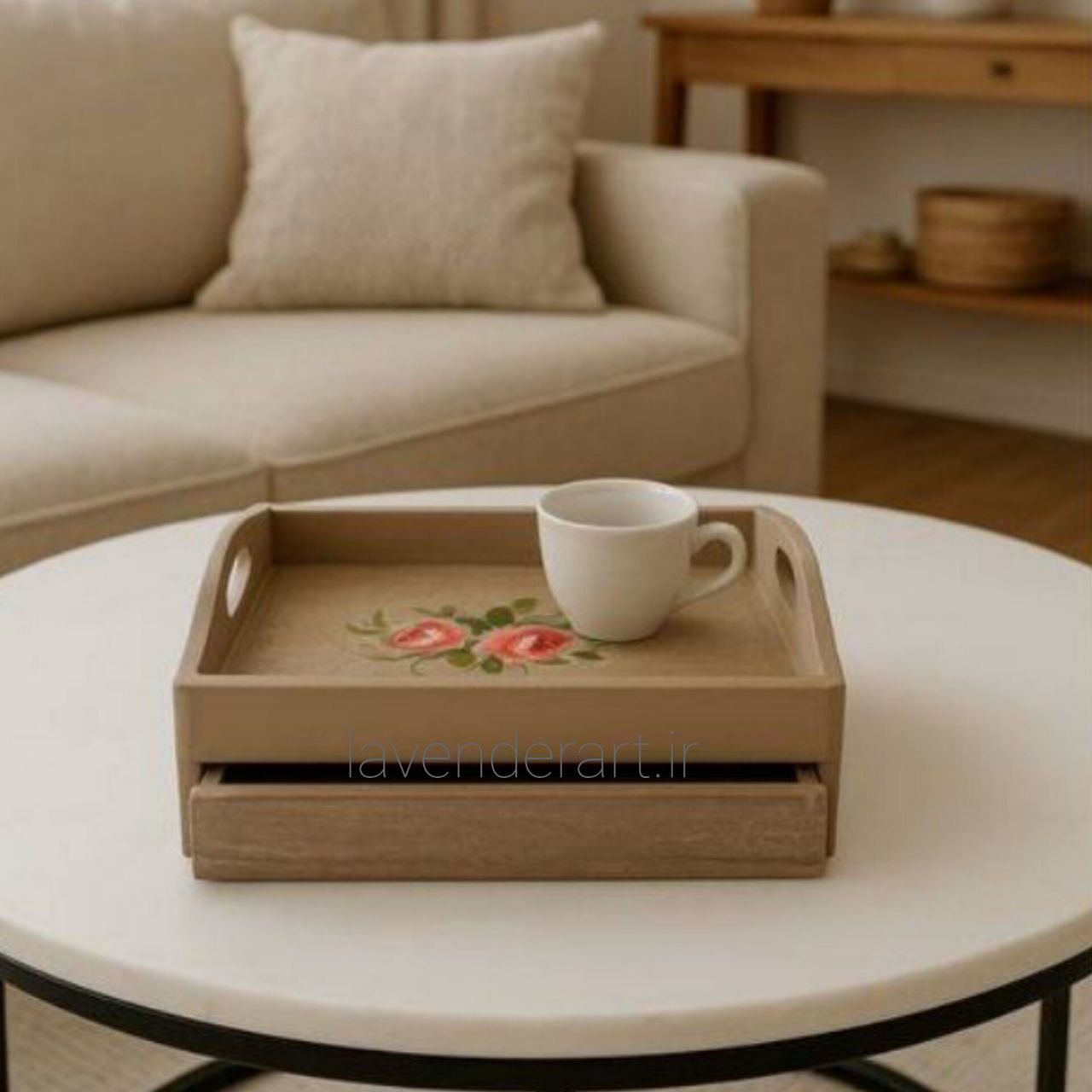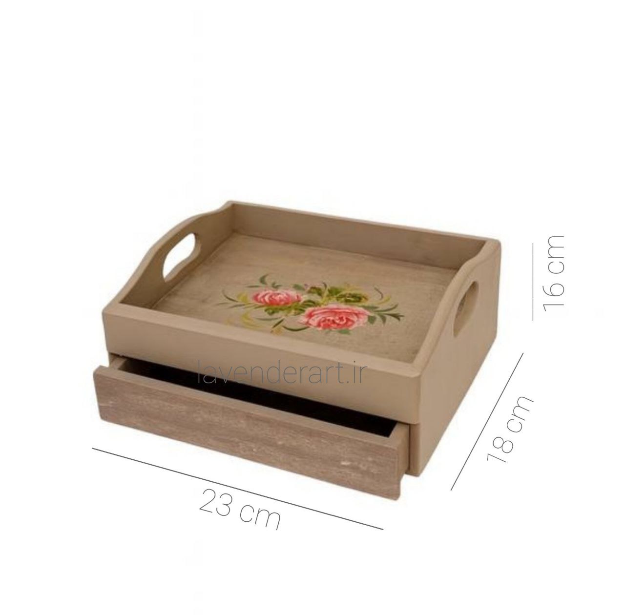 سینی چوبی کشودار با نقاشی دستکار گل های صورتی