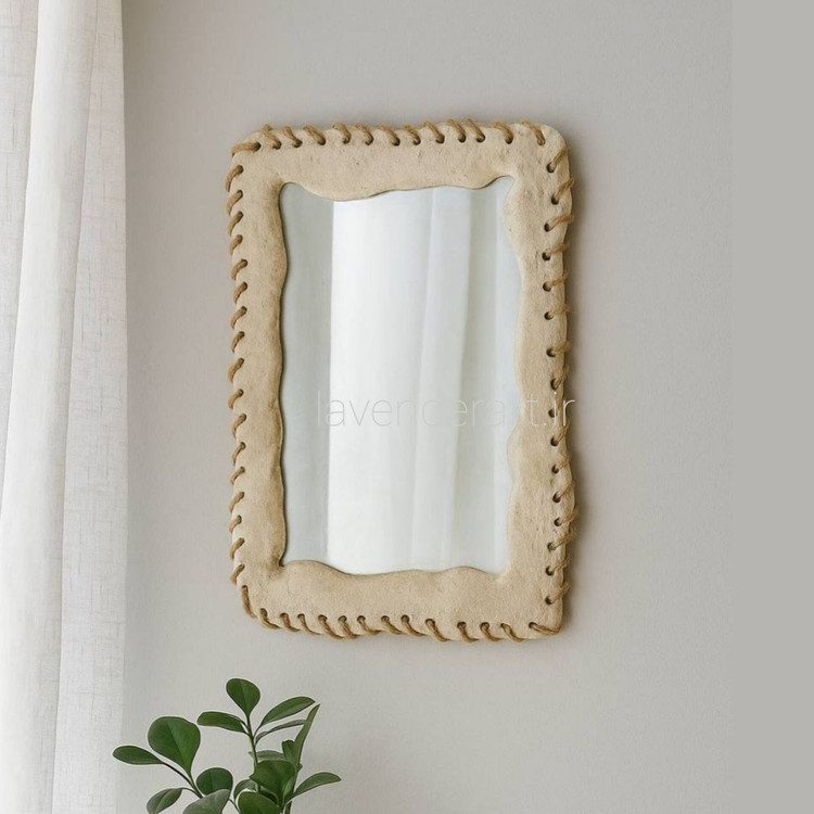 آینه دستساز از جنس پاپیه ماشه، با فرم نرم و بافت طبیعی اش، حس سادگی و آرامش را به فضا می آورد.