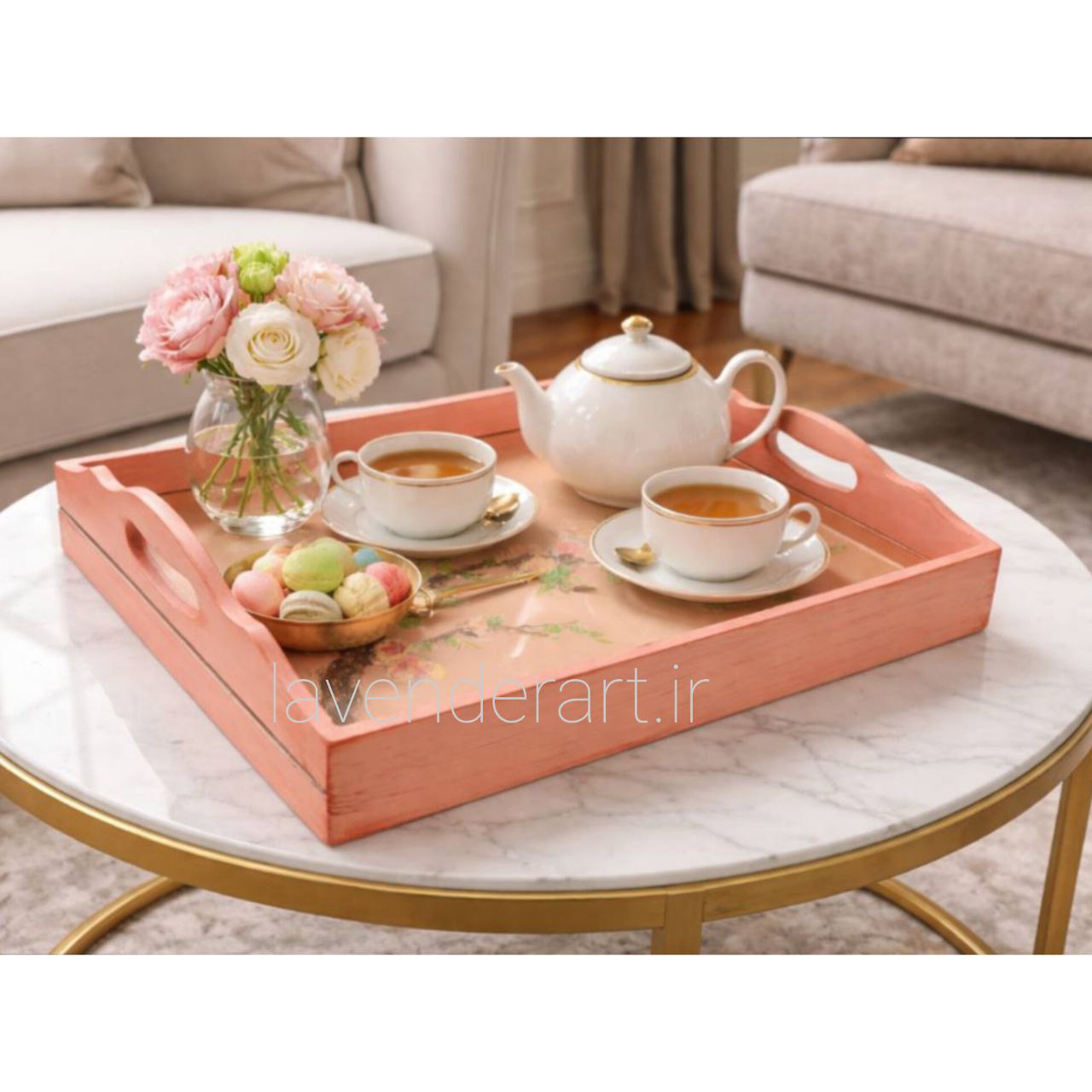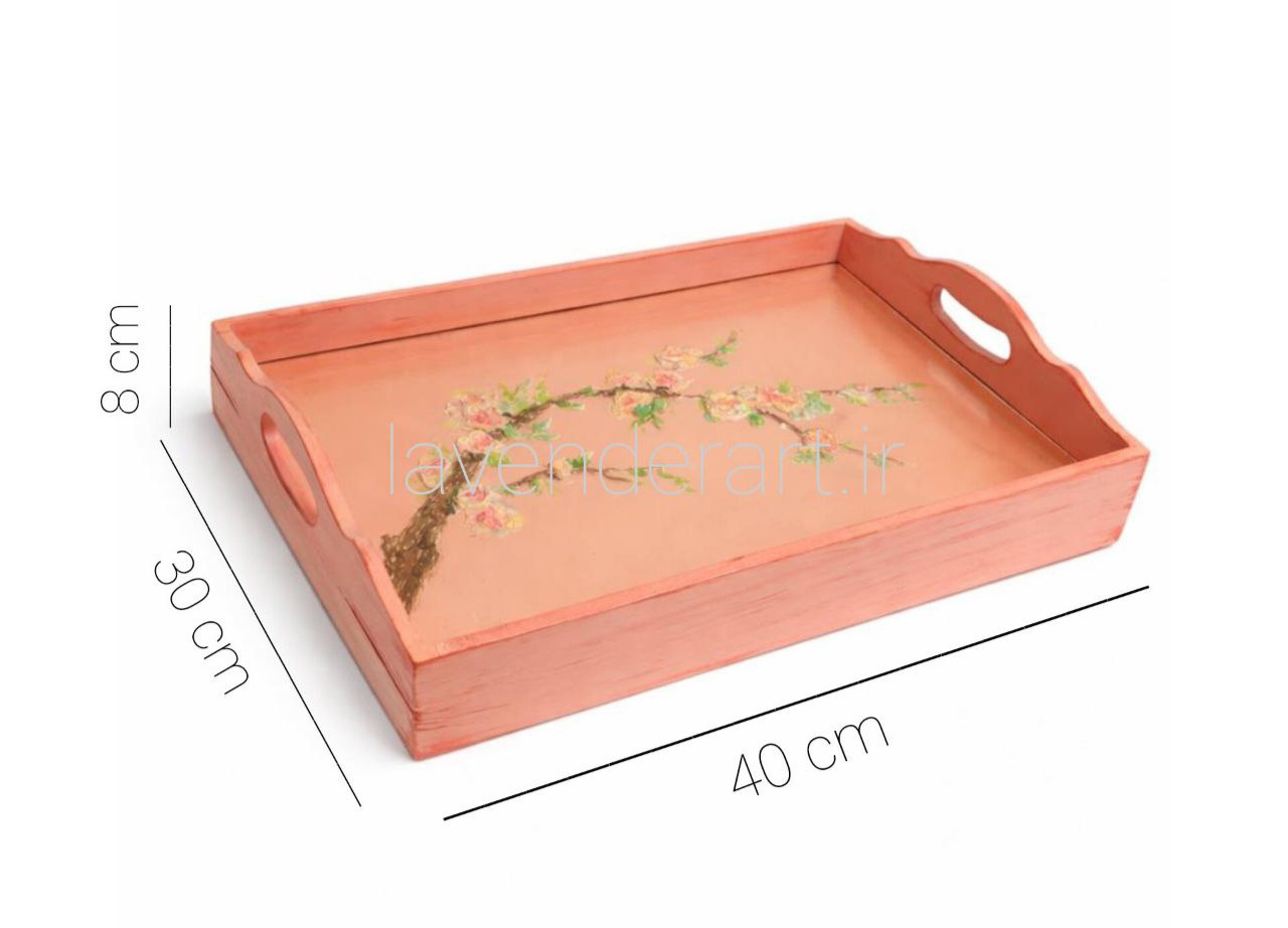 این سینی چوبی با نقاشی لطیف و برجسته گل ها، حس یک صبح آرام را با خودش دارد؛ انگار تکه ای از باغ را روی میز می گذاری.