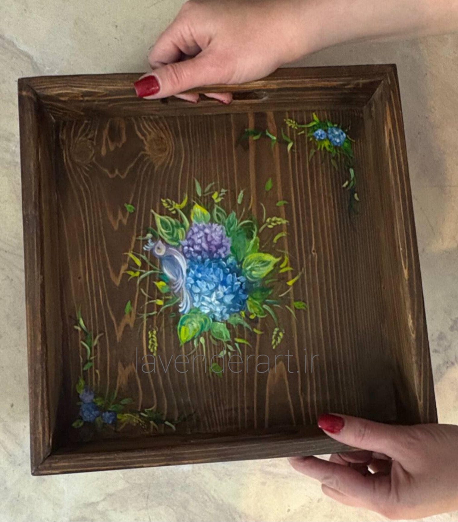 این سینی چوبی با نقاشی رنگ و روغن لطیف و گل ها و پرنده، حس یک صبح آرام را با خودش دارد؛ انگار تکه ای از باغ را روی میز می گذاری.