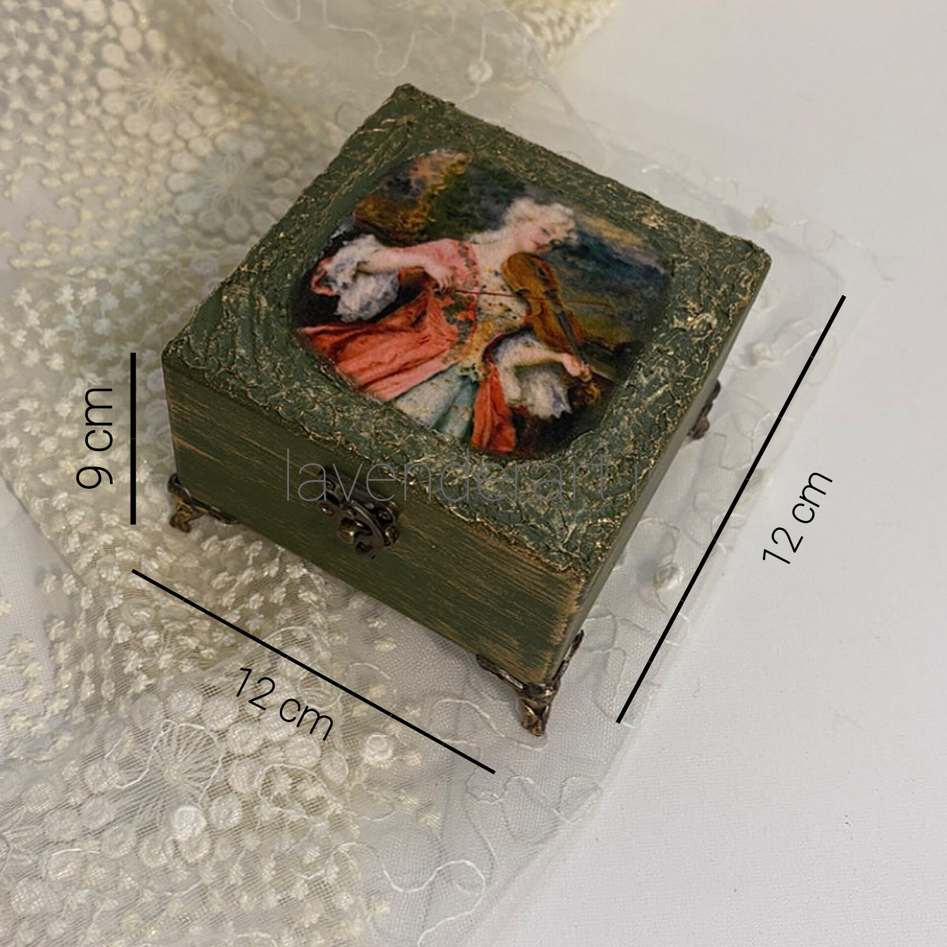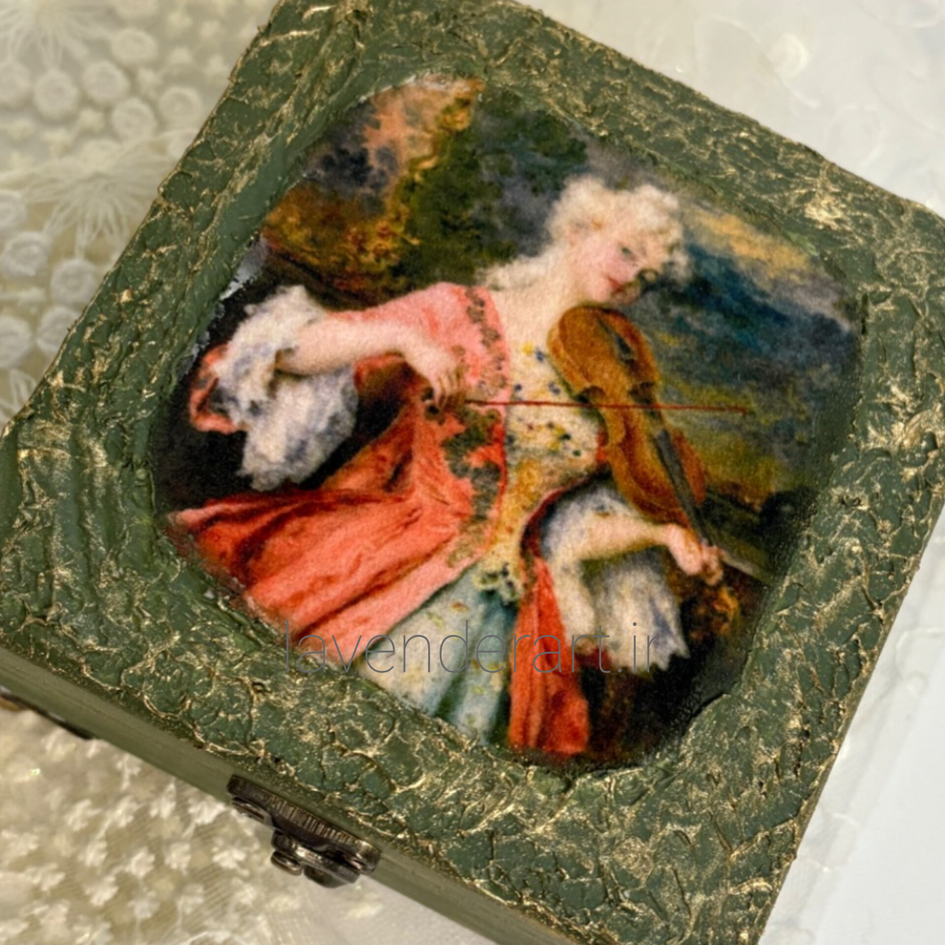 برای طرح روی در جعبه از تکنیک مخمل استفاده شده است تا حال و هوایی از دوران کلاسیک را القا کند. جنس جعبه از ام دی اف مرغوب می باشد.