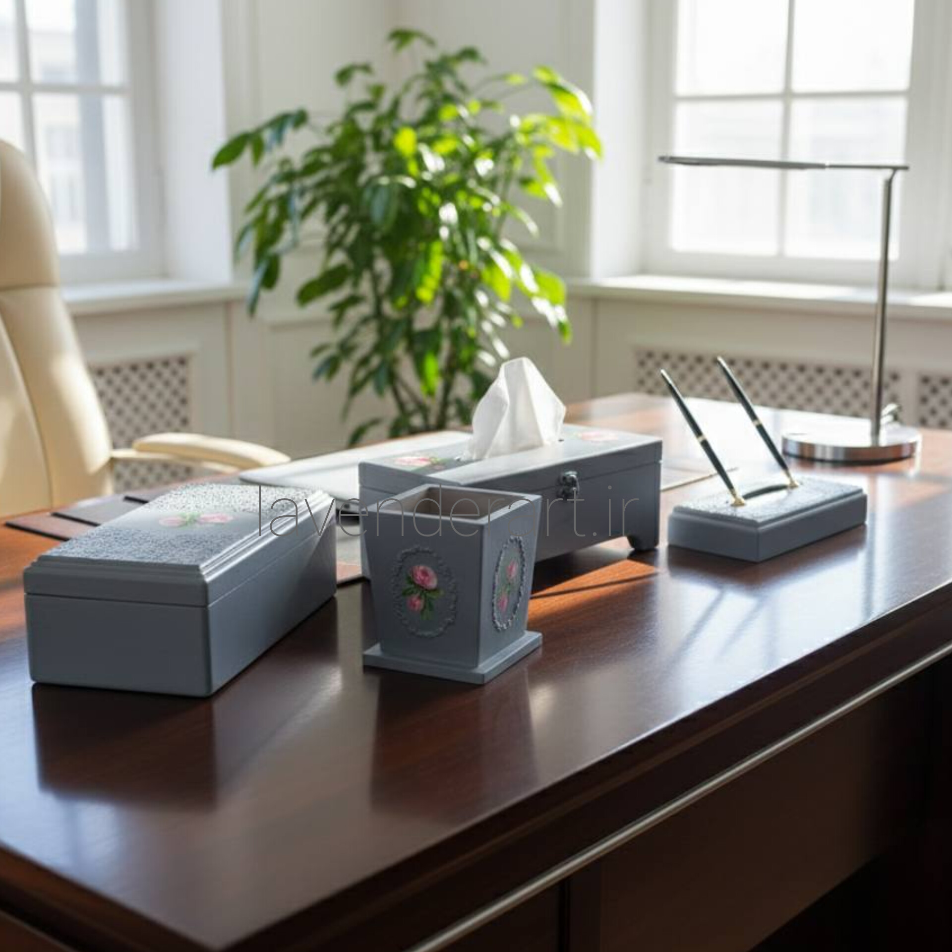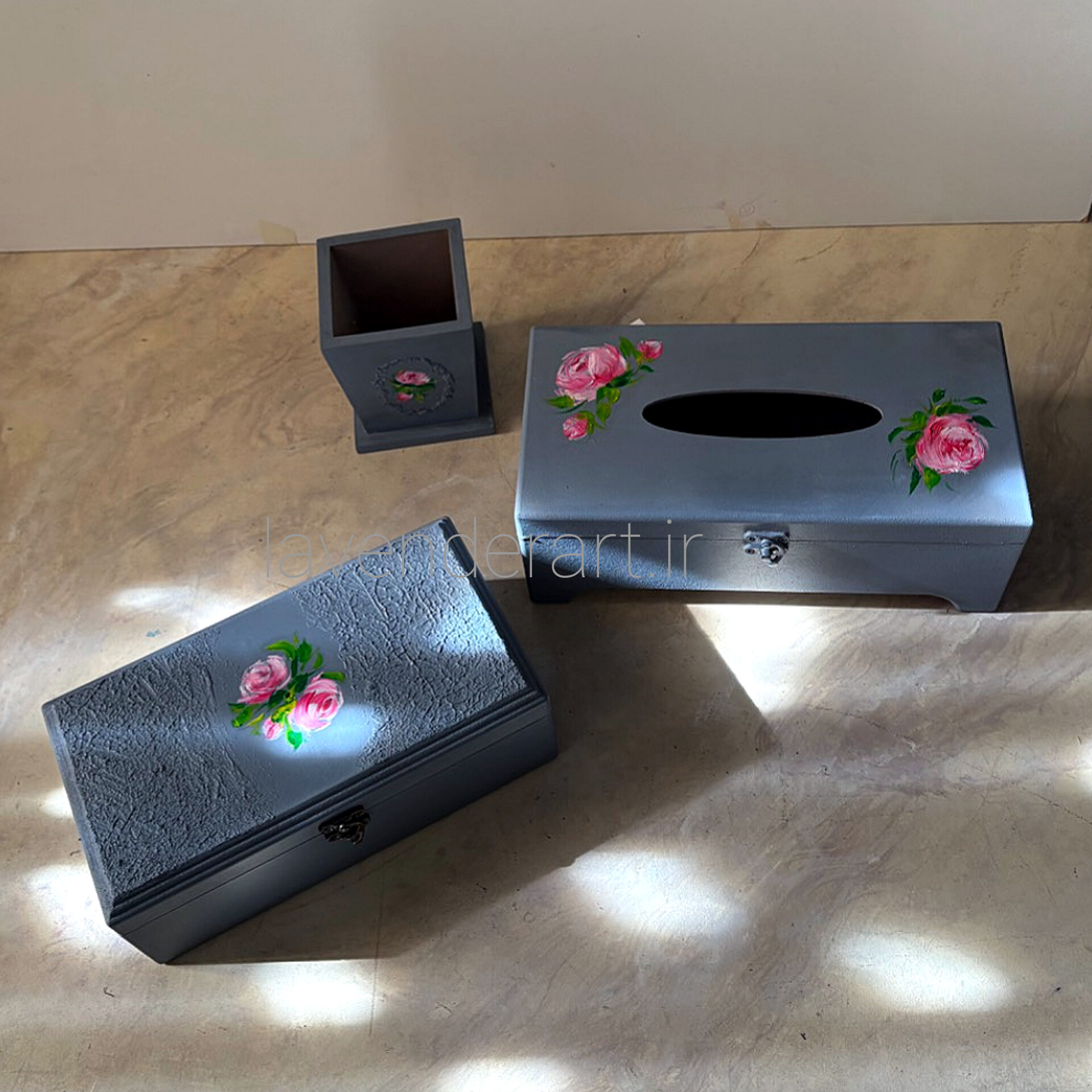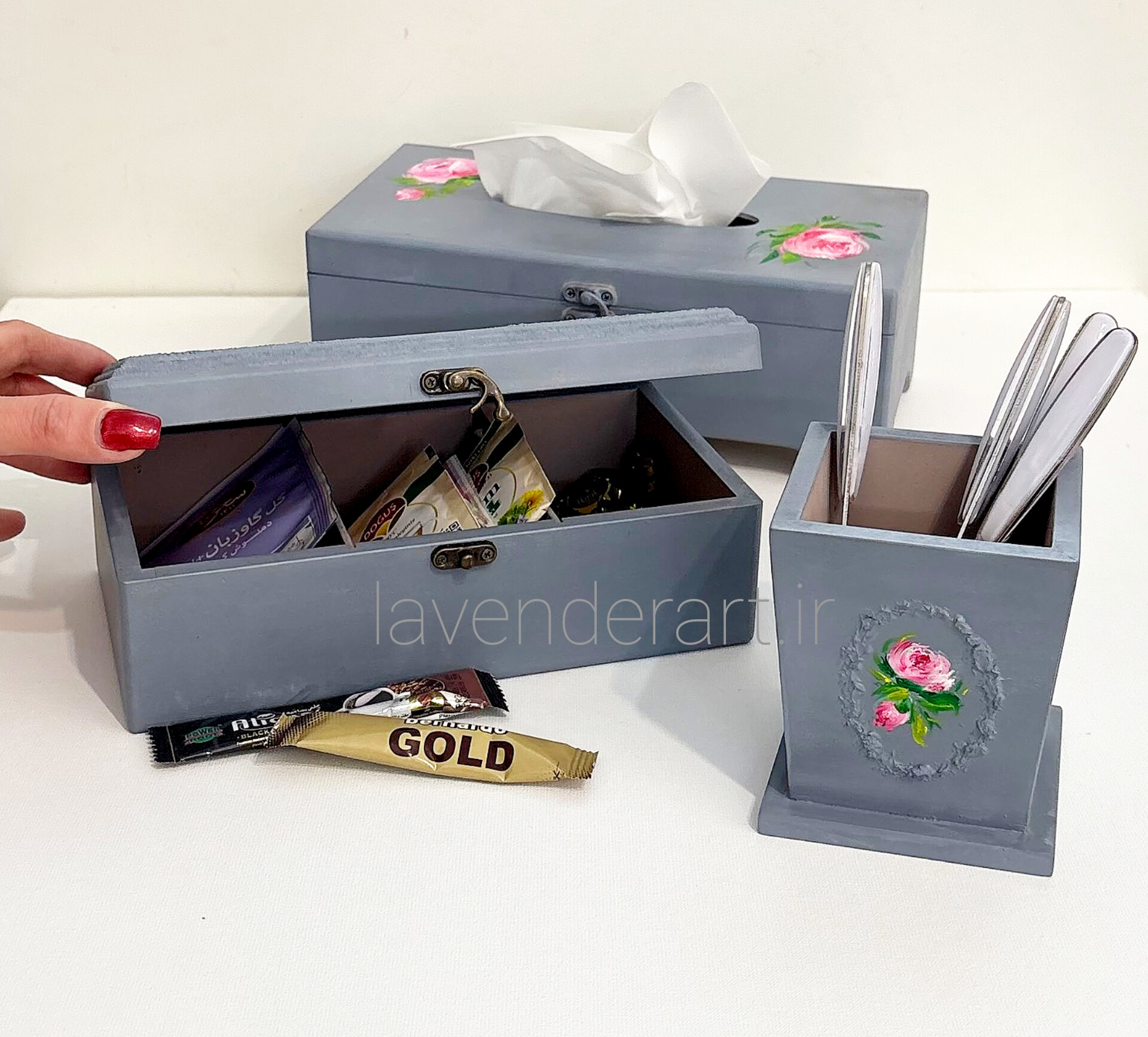 ست جعبه دستمال کاغذی، جعبه تیبگ و جای کارد و چنگال می تواند زیبایی منحصربفردی را به میز پذیرایی شما بدهد.