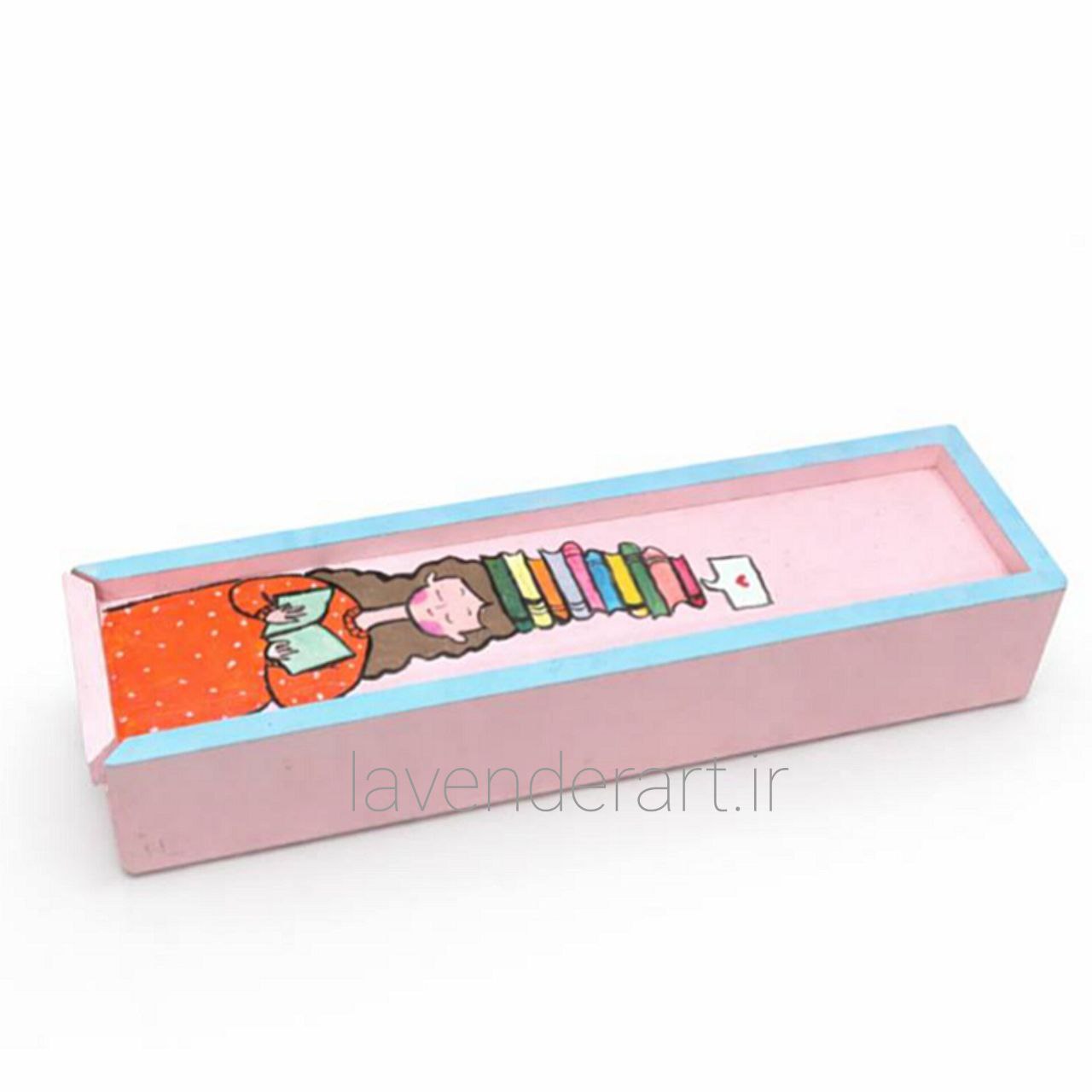 جای قلمی چوبی با در کشویی و نقاشی دخترک کتابخوان