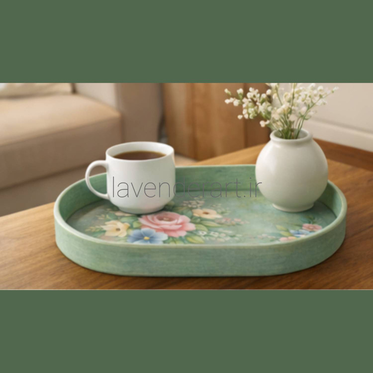 این سینی چوبی با نقاشی رنگ و روغن لطیف و گل ها، حس یک صبح آرام را با خودش دارد؛ انگار تکه ای از باغ را روی میز می گذاری.