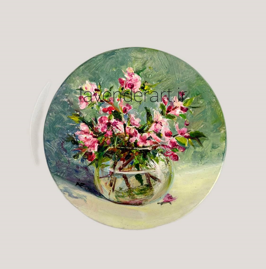 این اثر هنری با الهام از شکوفه های گیلاس و با تکنیک رنگ روغن روی بوم چوبی دایره اجرا شده است.