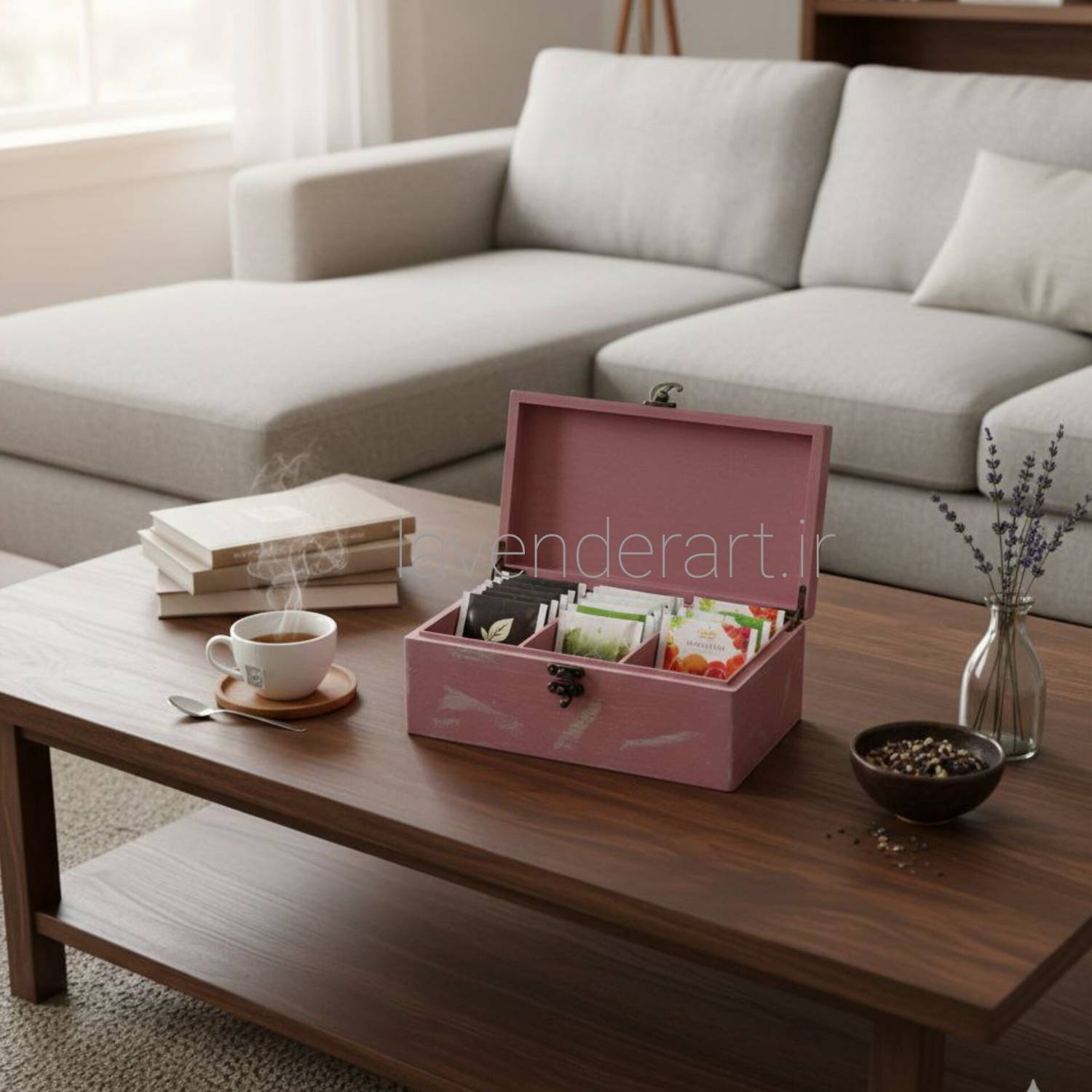جعبه تیبگ چوبی با طراحی کلاسیک و کاربردی، انتخابی شیک برای نظمدهی به انواع دمنوش و چای کیسهای. این جعبه با درب لولادار و محفظههای جداگانه، هم در آشپزخانهی خانگی و هم در محیط کار یا پذیرایی جلوهای مرتب و زیبا ایجاد میکند.