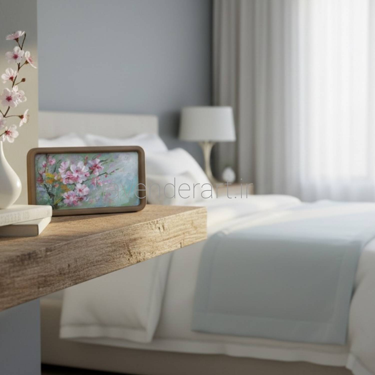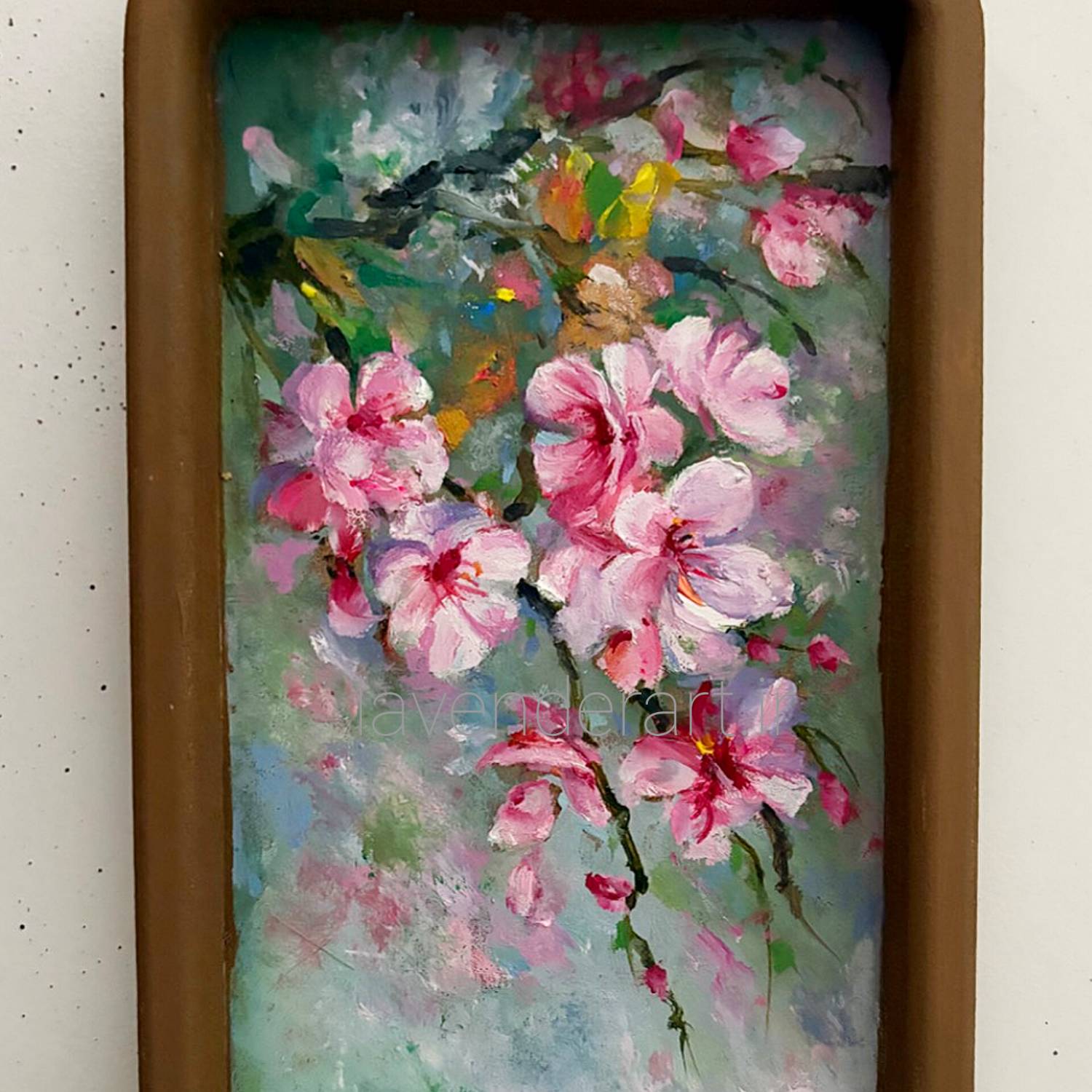 این اثر هنری با الهام از شکوفه های گیلاس و با تکنیک رنگ روغن روی بوم چوبی اجرا شده است.