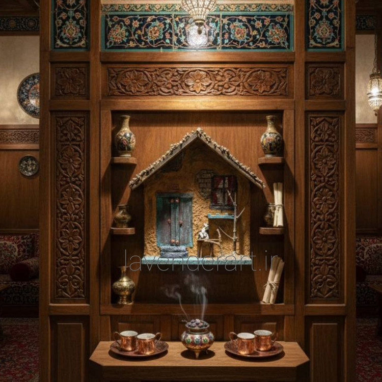 دیوارکوب سه بعدی کلبه روستایی، ساخته شده با تکنیک میکس مدیا، حال و هوای صمیمی و آرامش روستا را به فضا می دهد.