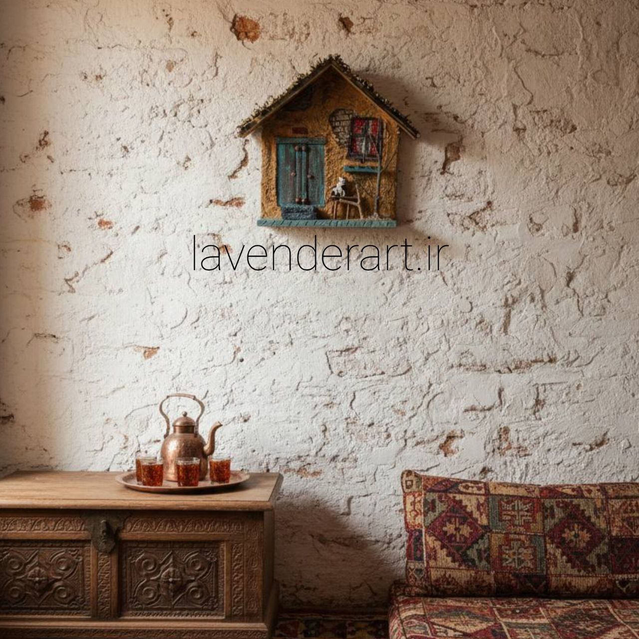 دیوارکوب سه بعدی کلبه روستایی، ساخته شده با تکنیک میکس مدیا، حال و هوای صمیمی و آرامش روستا را به فضا می دهد.