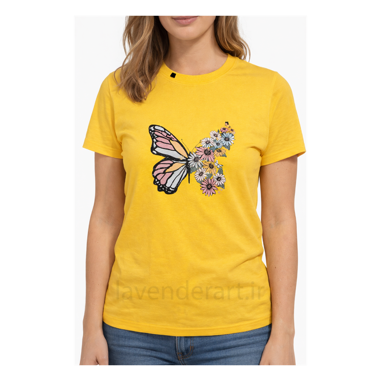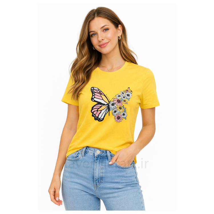 تیشرت زرد نخی با چاپ گل و پروانه