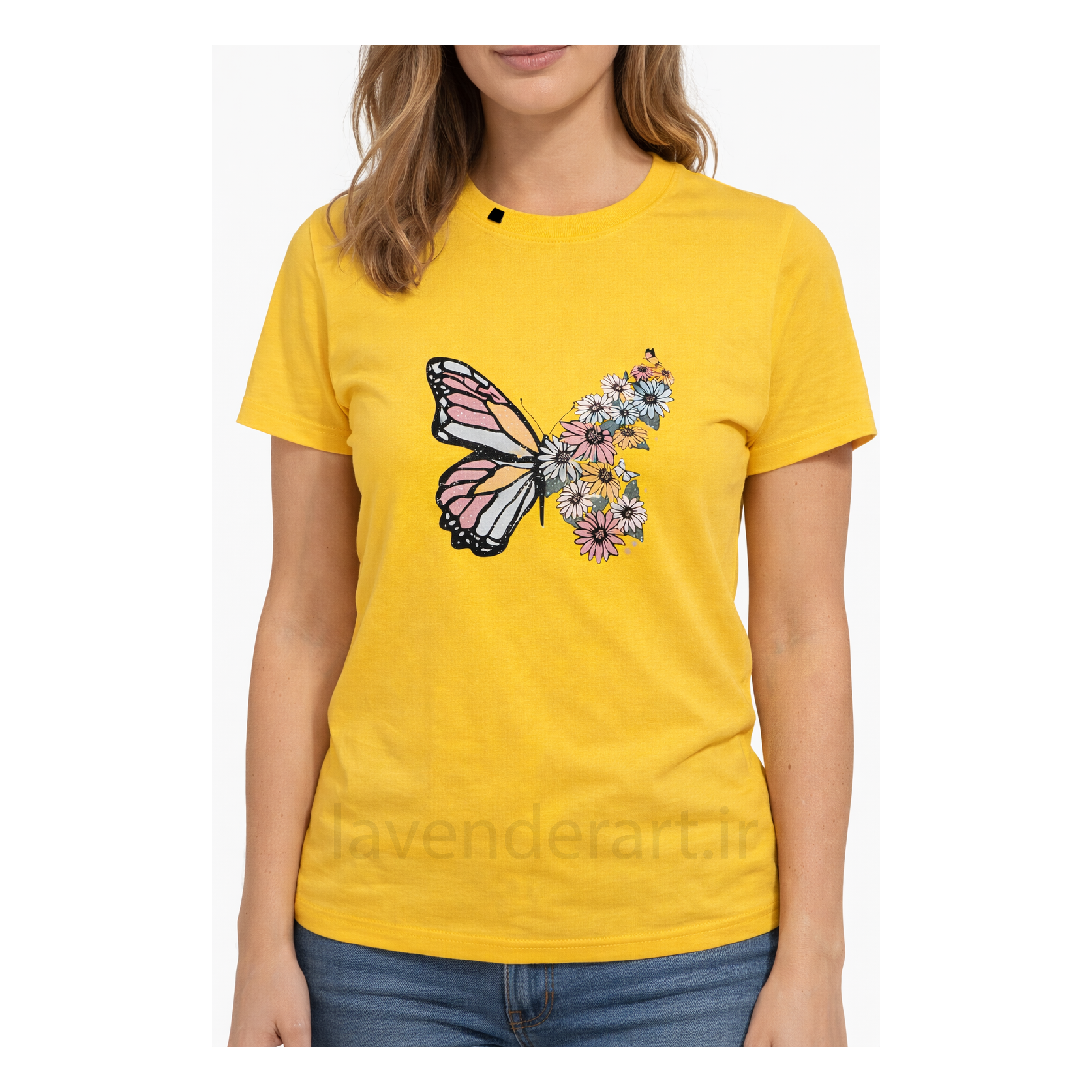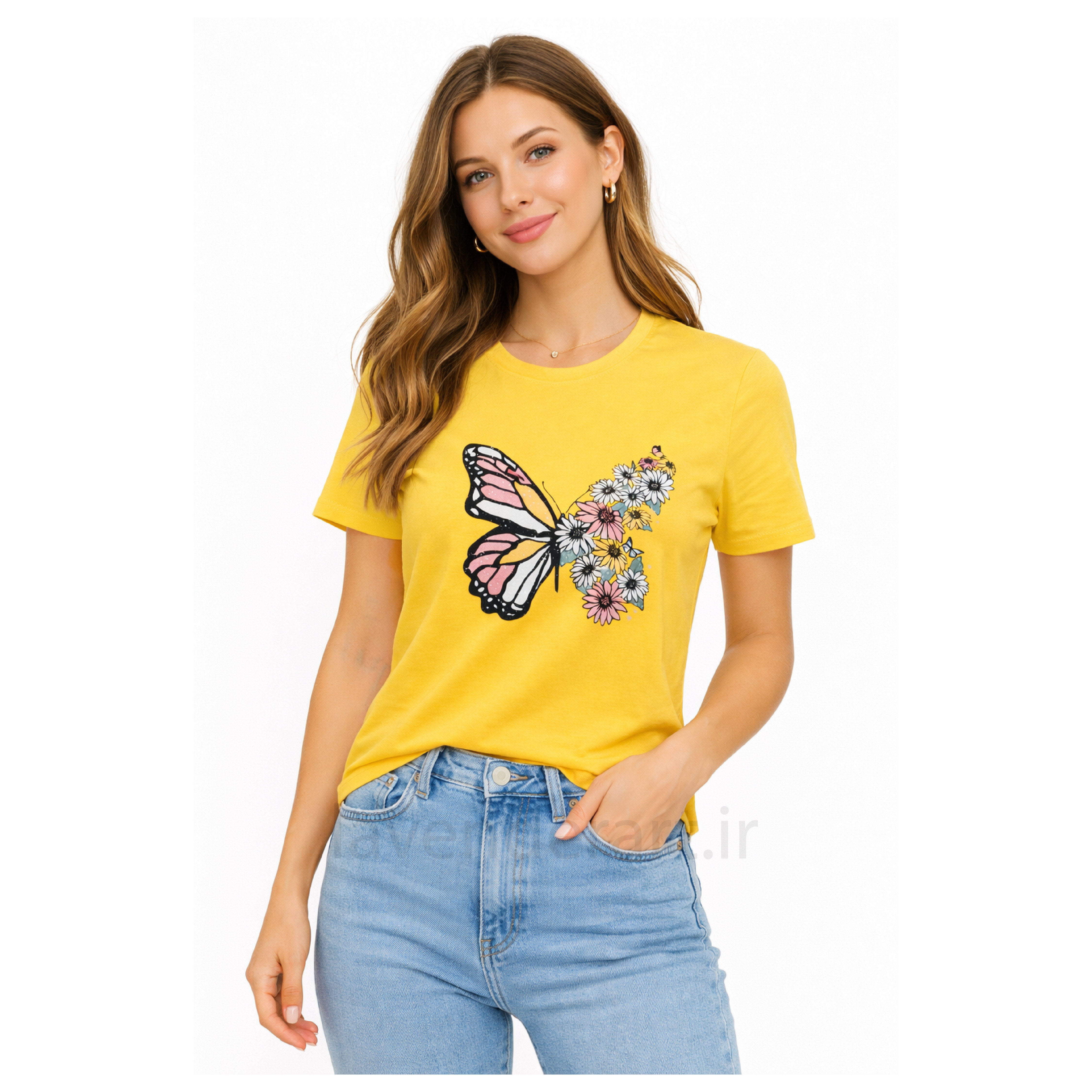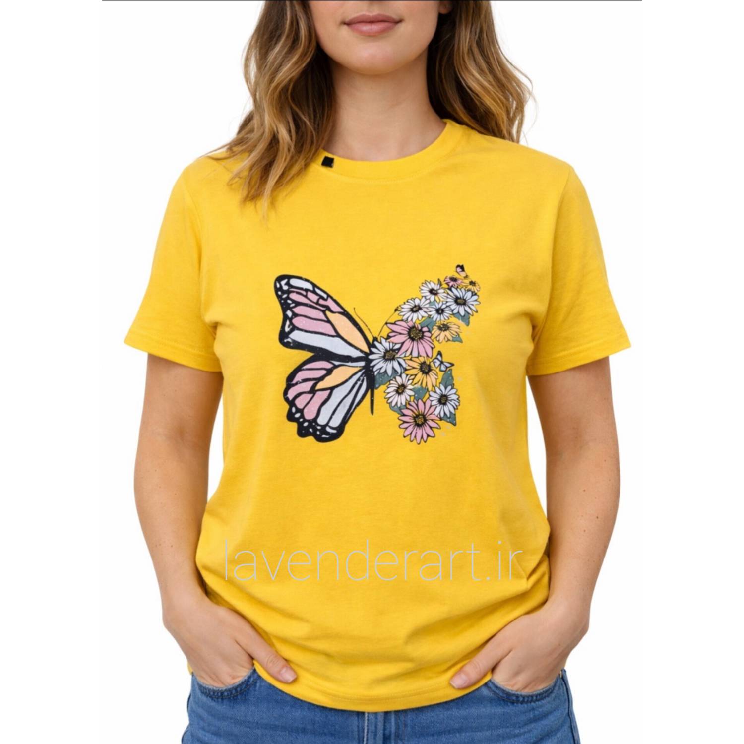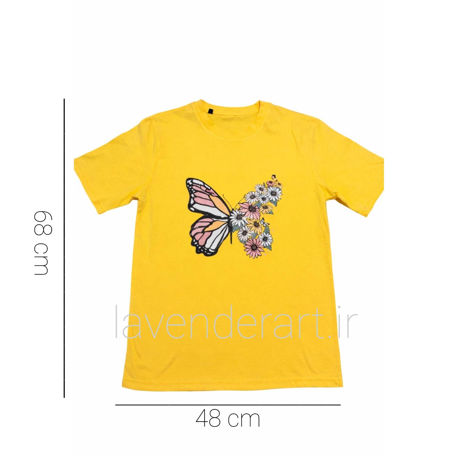 تیشرت زرد نخی با چاپ گل و پروانه