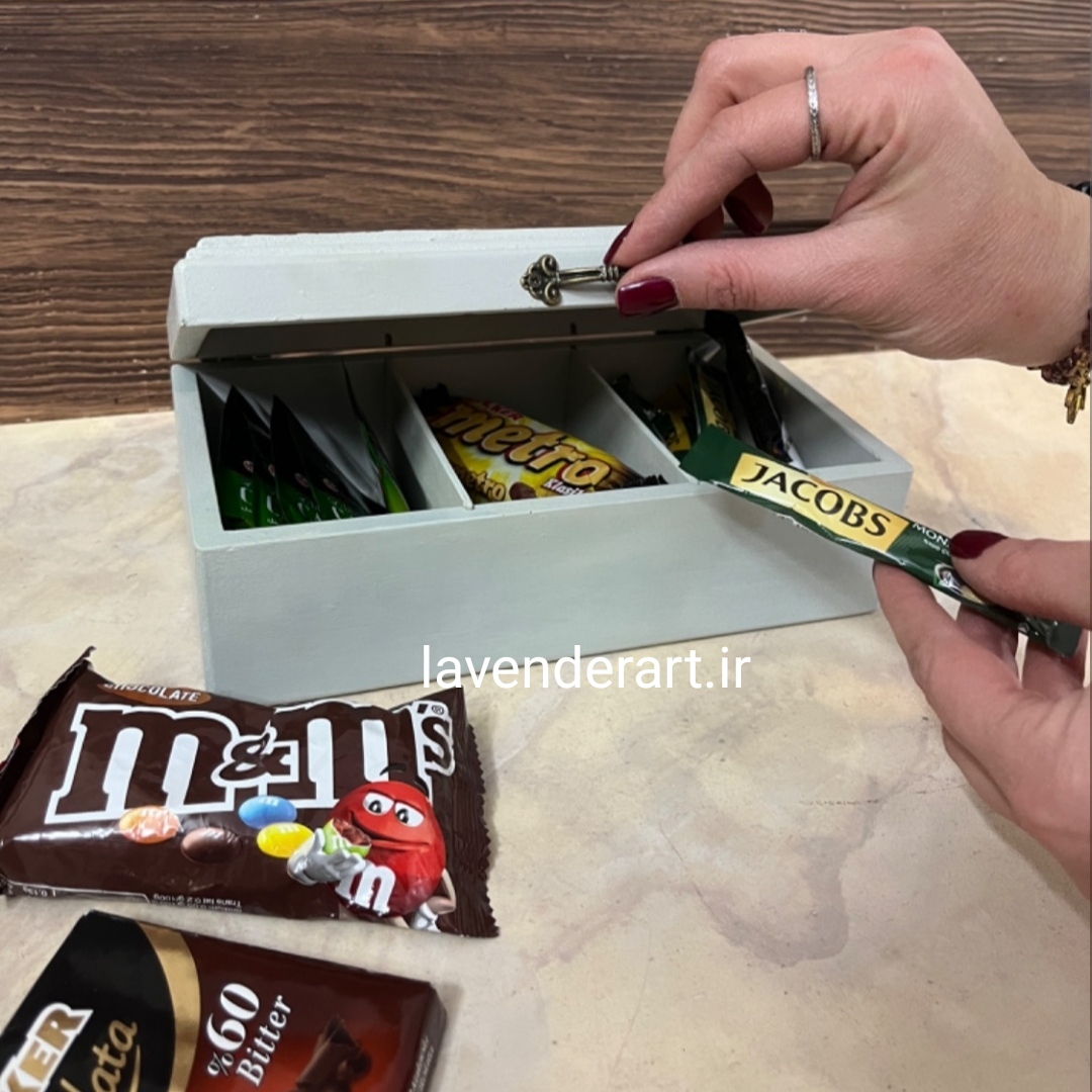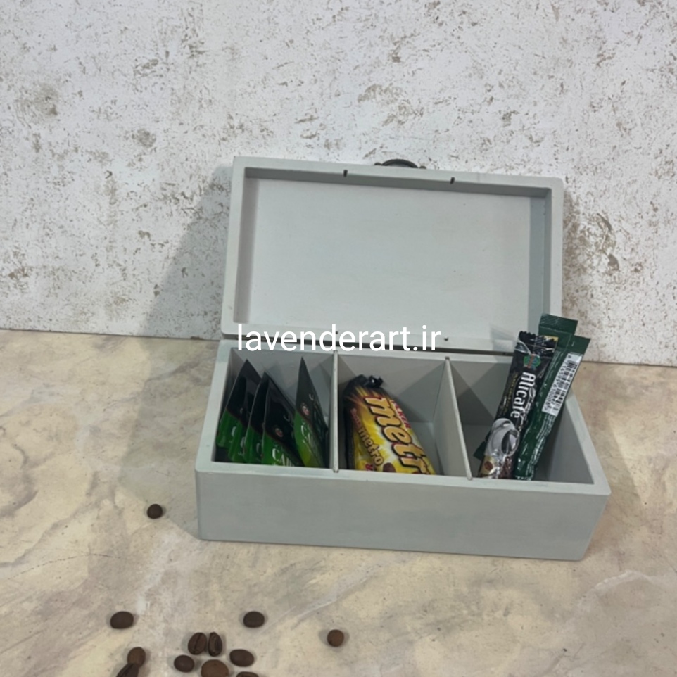 جعبه تیبگ چوبی با طراحی کلاسیک و کاربردی، انتخابی شیک برای نظمدهی به انواع دمنوش و چای کیسهای. این جعبه با درب لولادار و محفظههای جداگانه، هم در آشپزخانهی خانگی و هم در محیط کار یا پذیرایی جلوهای مرتب و زیبا ایجاد میکند.