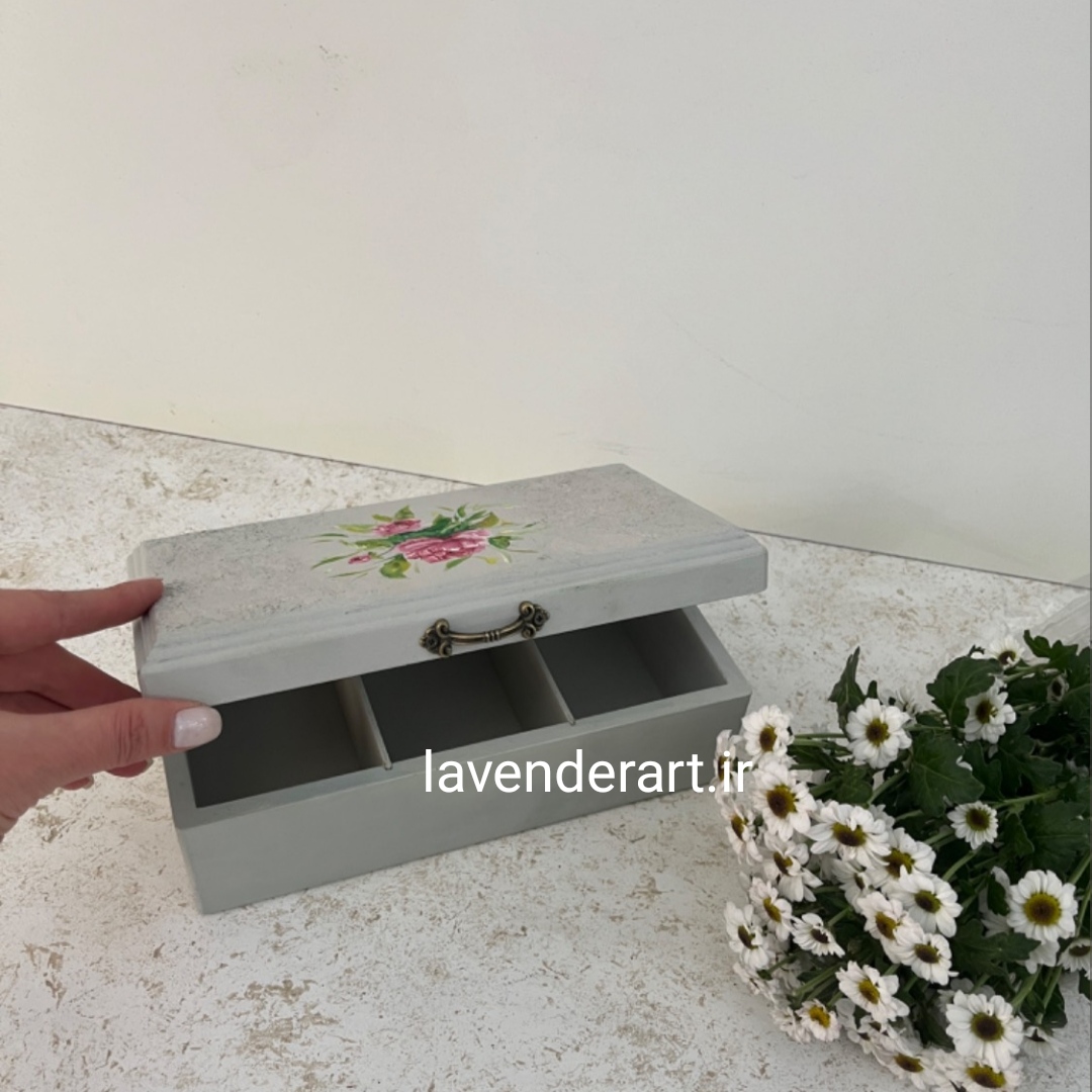 جعبه تیبگ چوبی به رنگ کرم ـ طوسی و با طرح گل رز صورتی