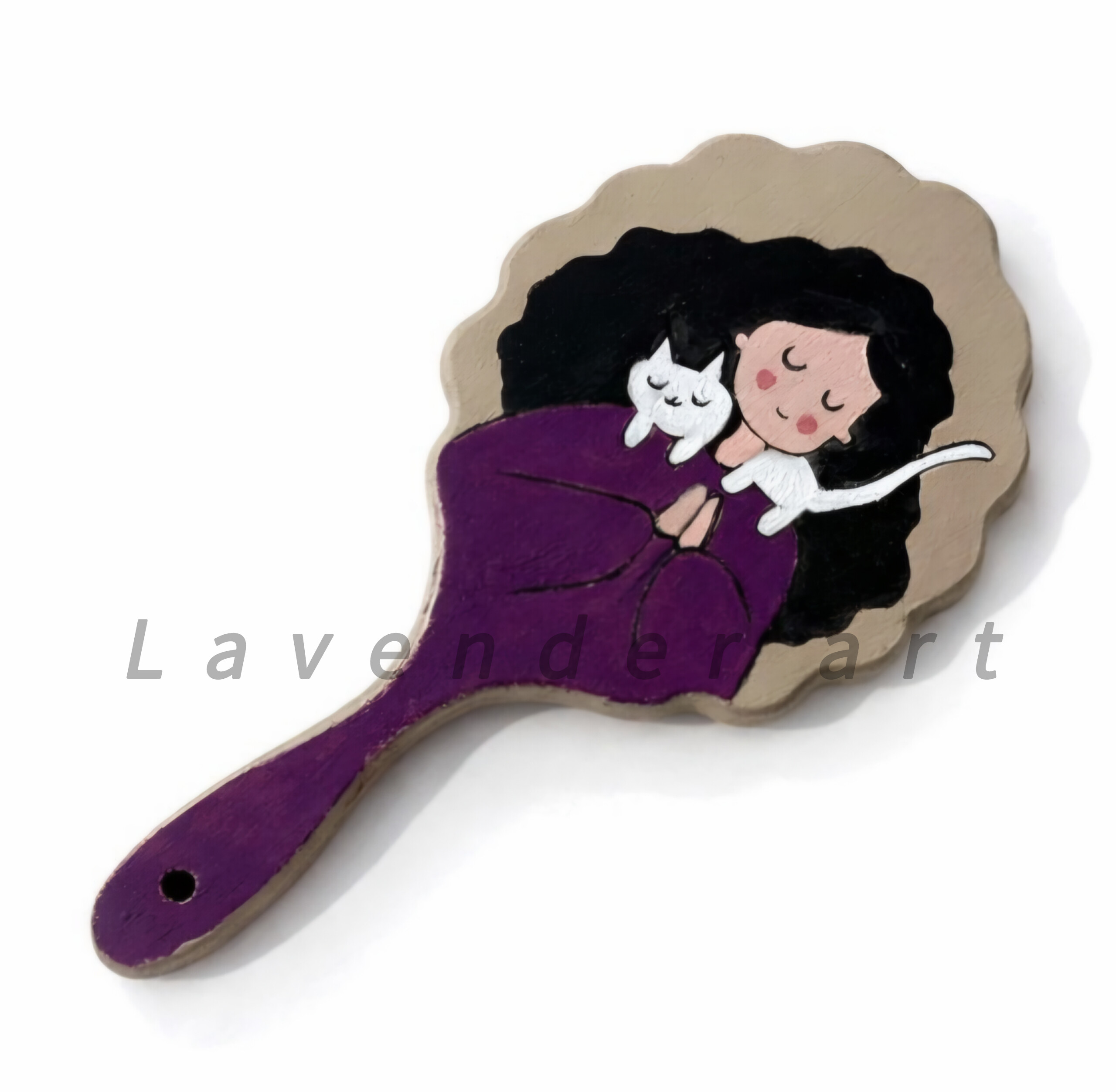 آینه چوبی دستی بنفش با طرح نقاشی دخترک و گربه